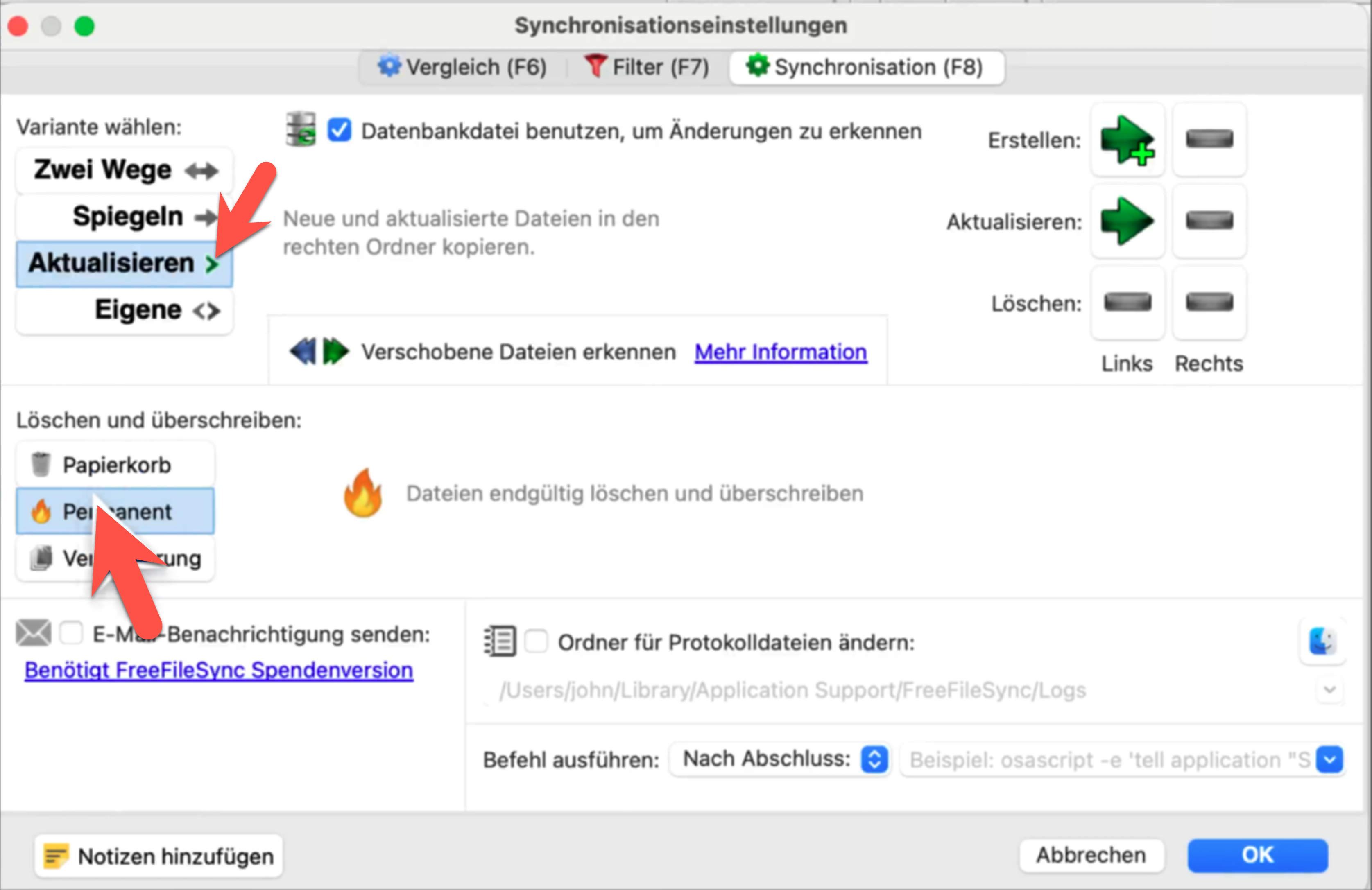 Bei "Synchronisieren" am besten "Aktualisieren" einstellen